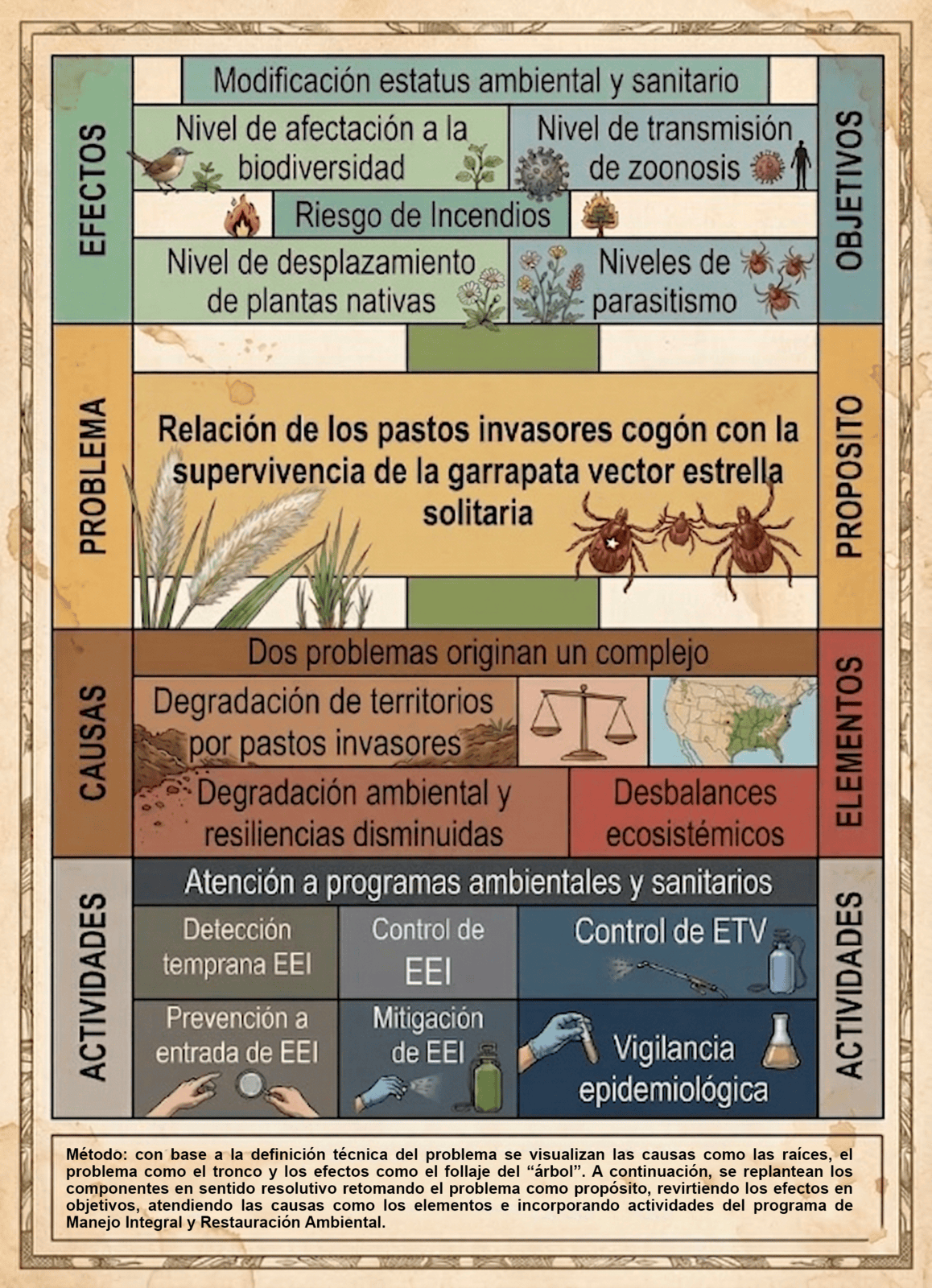 A continuación, compartimos un árbol lógico de soluciones para abordar el problema con un enfoque de “Una Salud” que incorpora el manejo integral de plagas o vectores y la restauración ambiental.